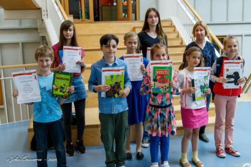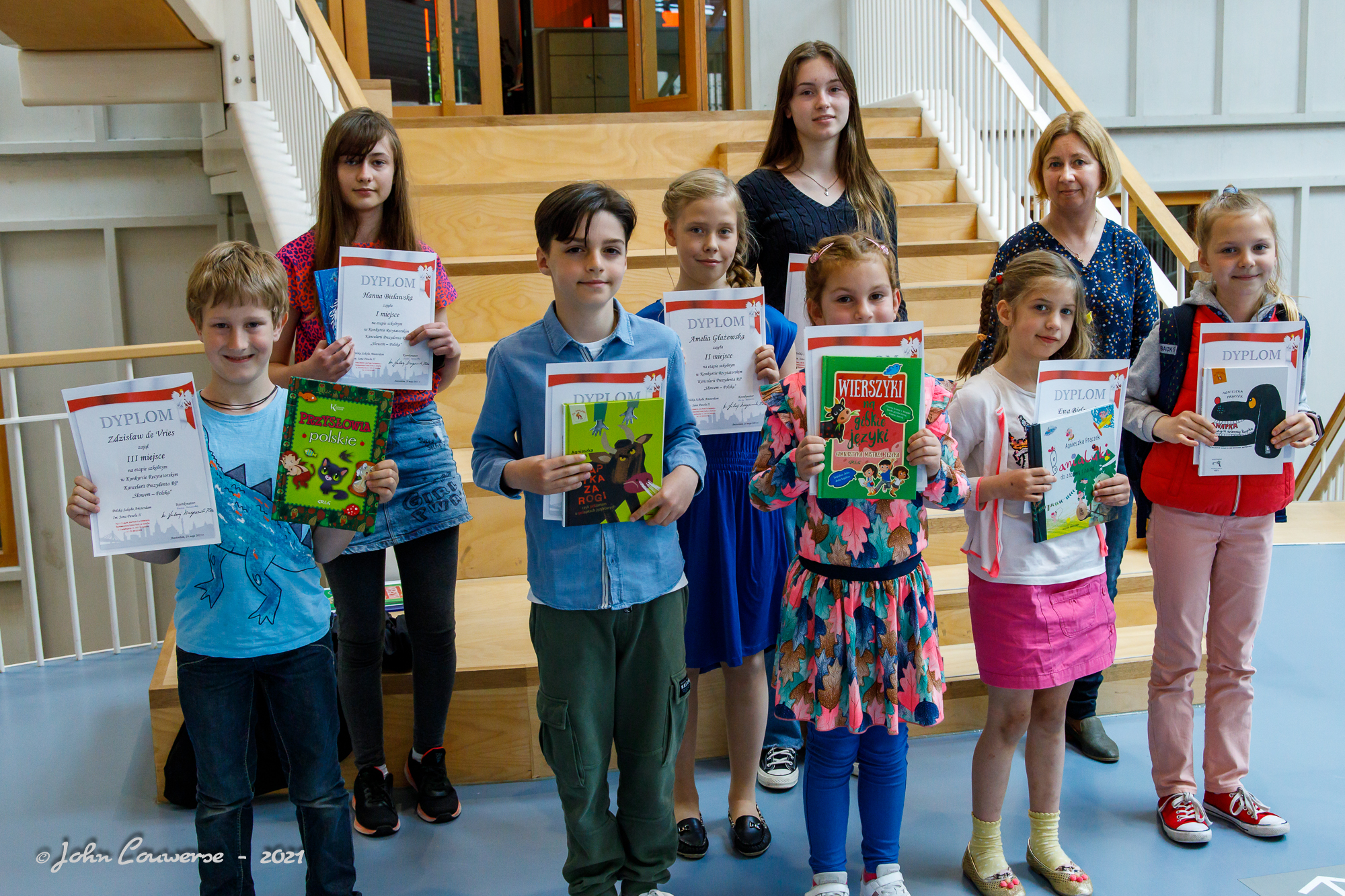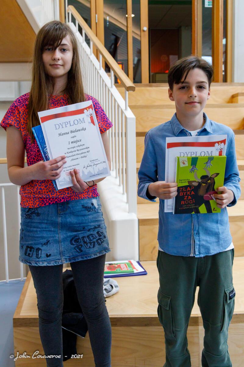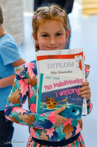 De laureaten van het schooltoneel: Ewa, Fabian, Zdzisio, Małgosia, Amelka, Hania, Carmen, Diana, Patryk en de vierjarige Thijs ontvingen diploma’s en boekprijzen. Proficiat aan onze getalenteerde leerlingen (en broers en zussen)!